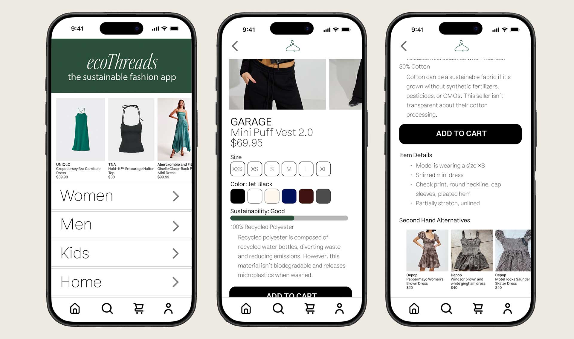 EcoThreads is a sustainable fashion app that merges new and secondhand clothing into one cohesive shopping experience—something most fashion platforms don’t currently offer. Alongside marketplace functionality, the app educates users about the environmental impact of different fibers, using an algorithm that promotes more balanced, sustainable purchasing habits.