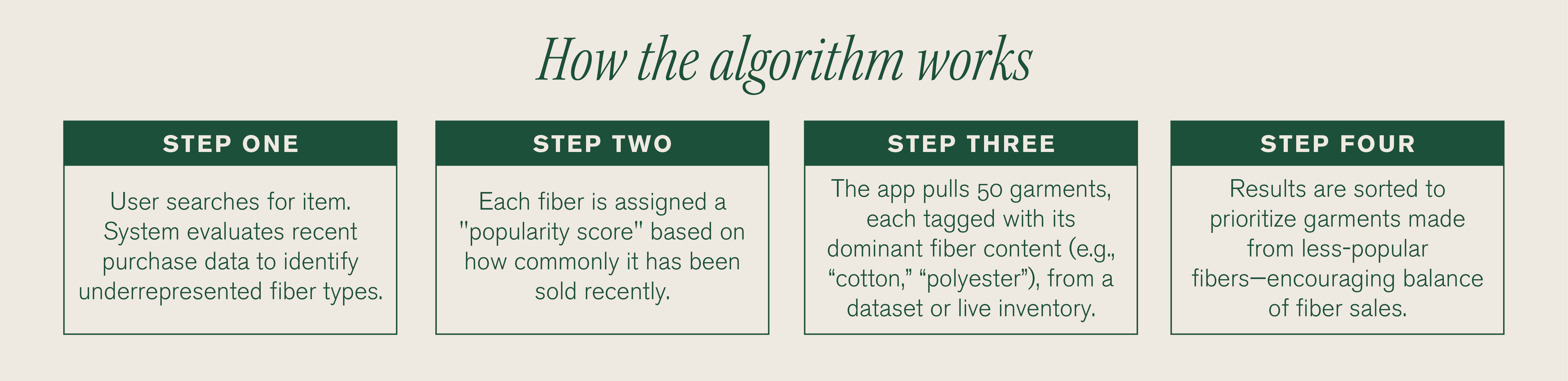 During research, I discovered that no single fiber is perfectly sustainable across its entire lifecycle. Instead, sustainability improves when we maintain a healthy balance of different fiber types. To support this idea, I developed a custom algorithm that helps guide purchasing behavior within the app.