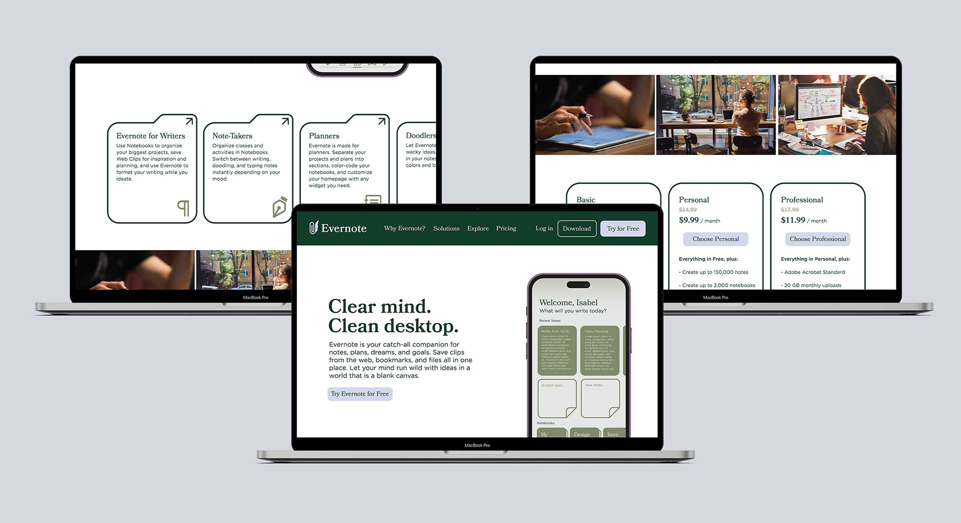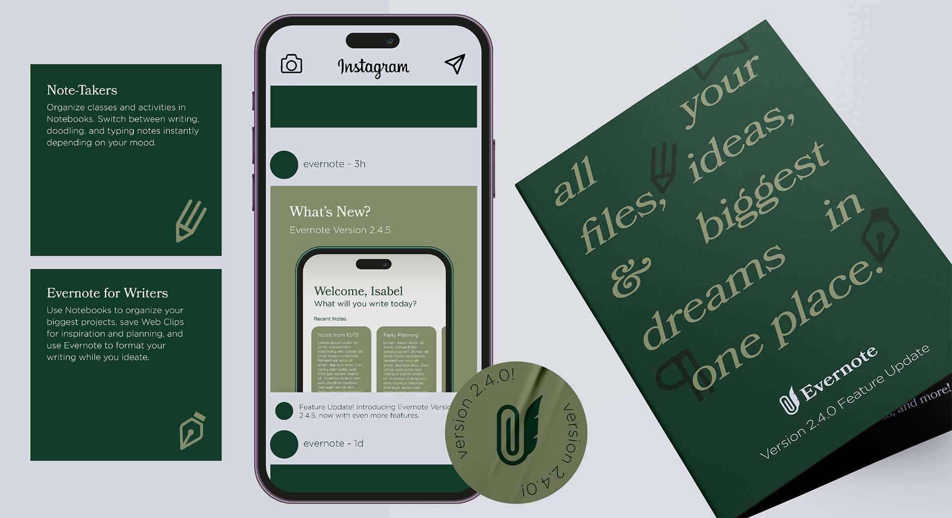 Evernote serves as a flexible companion for storing notes, lists, files, and ideas—designed for those who want creativity and organization to coexist. My goal was to translate that ethos into a visual identity that honors inspiration, structure, and a bit of the beautiful messiness that comes with creative thinking.